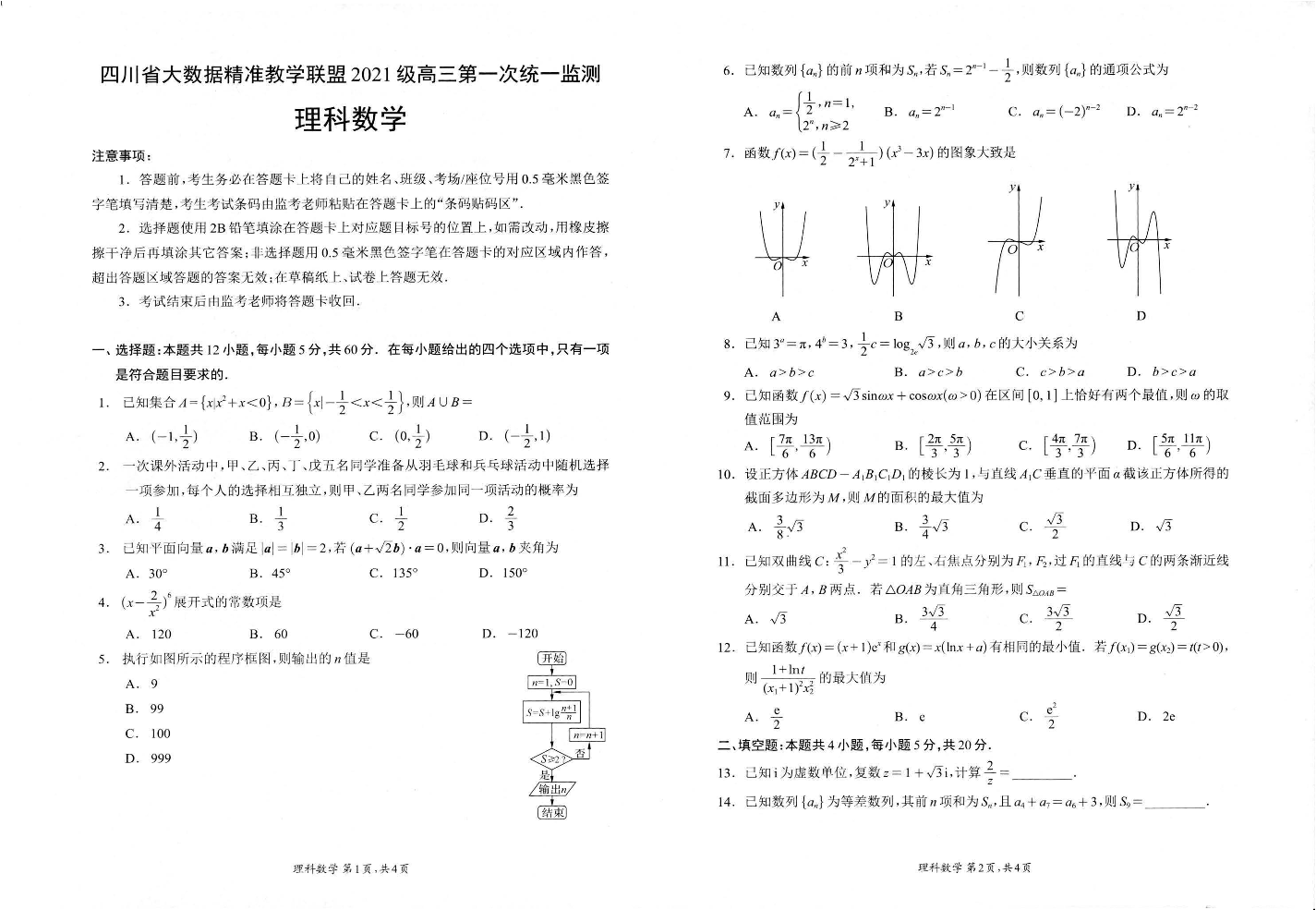 四川省大数据精准教学联盟2024届高三第一次统一监测理科数学