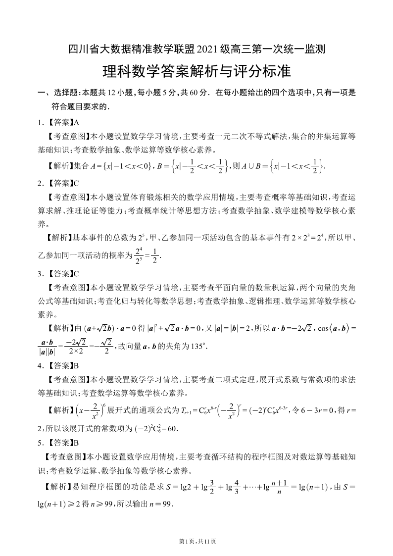四川省大数据精准教学联盟2024届高三第一次统一监测理科数学答案