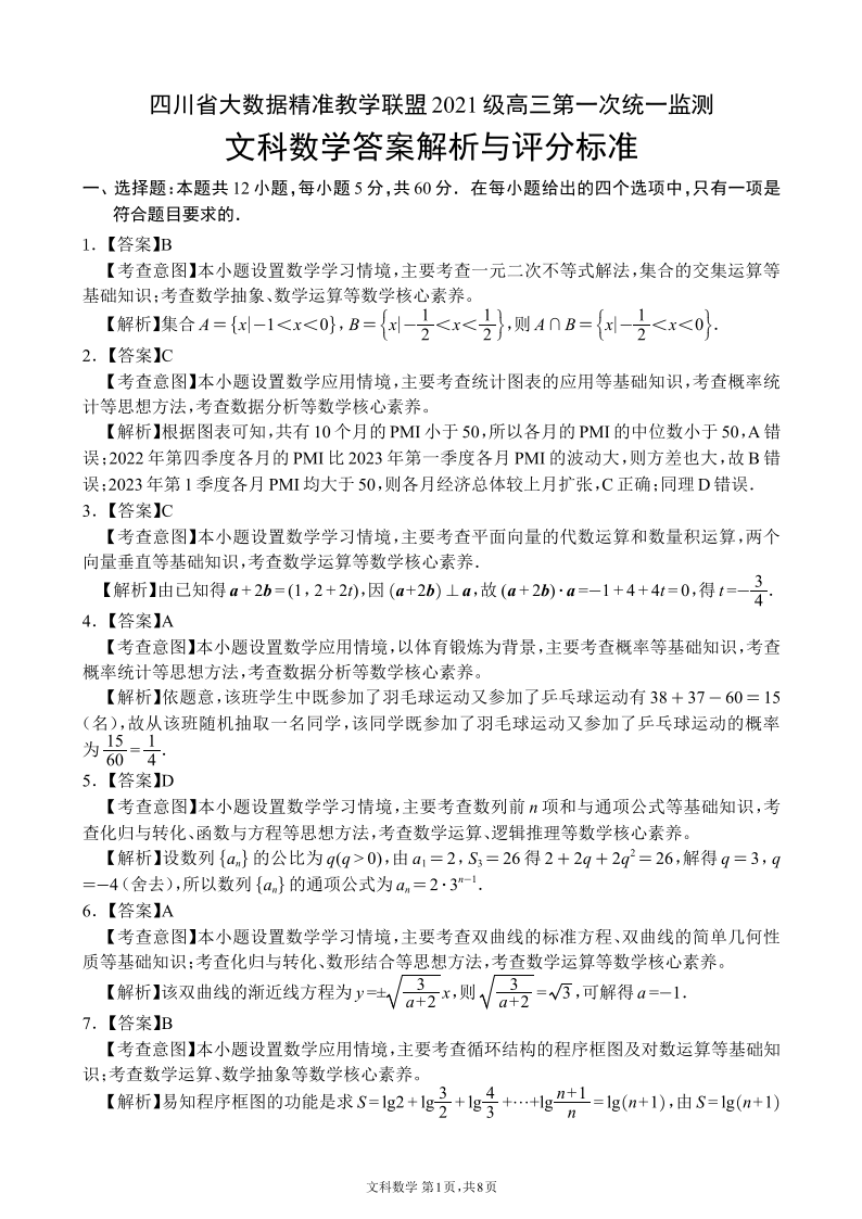 四川省大数据精准教学联盟2024届高三第一次统一监测文科数学答案