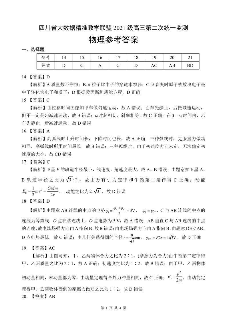 四川省大数据精准教学联盟2024届高三第一次统一监测物理答案