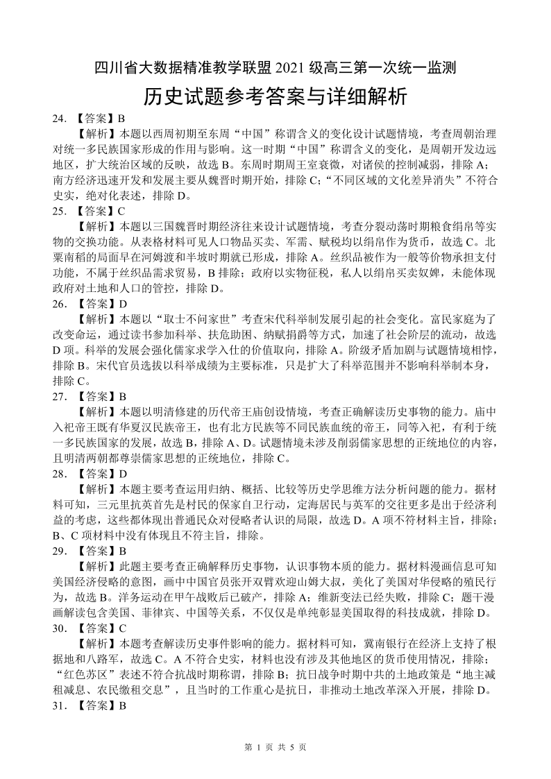 四川省大数据精准教学联盟2024届高三第一次统一监测历史答案