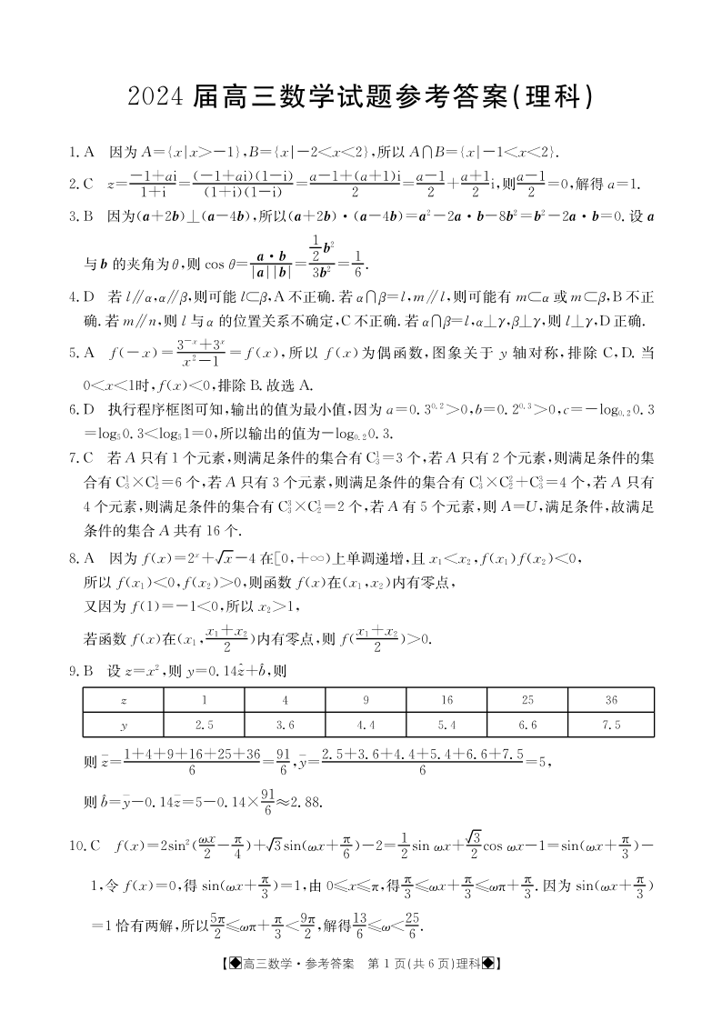 四川省雅安市2024届高三下学期2月开学考试理科数学答案