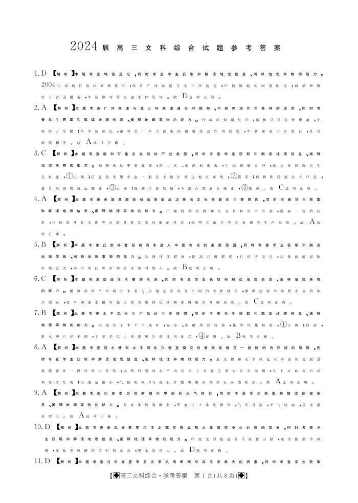 四川省雅安市2024届高三下学期2月开学考试文综答案
