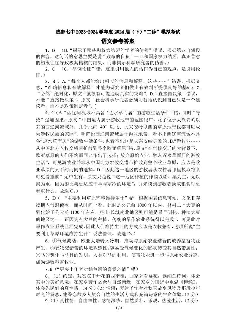 四川省成都市第七中学2024届高三下学期二诊模拟考试语文答案