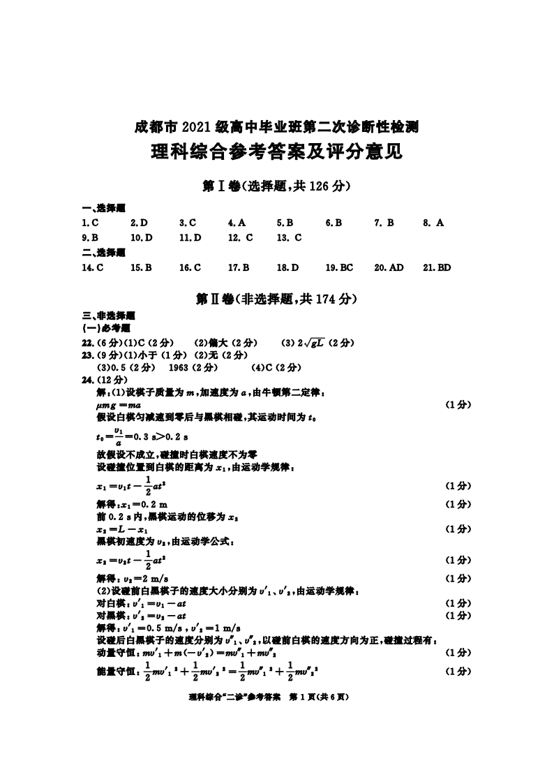 四川省成都市2021级高中毕业班第二次诊断性检测(成都二诊)理综答案