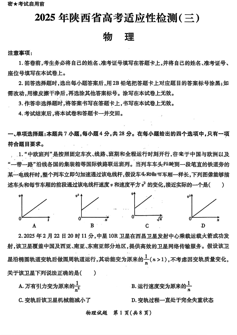 陕西省区域2024-2025学年下学期4月高三高考适应性检测(三)物理+答案