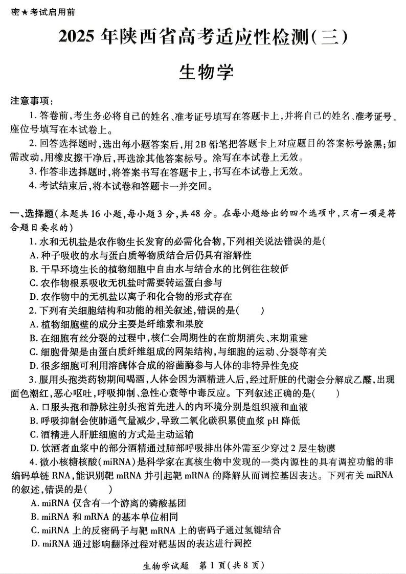 陕西省区域2024-2025学年下学期4月高三高考适应性检测(三)生物+答案