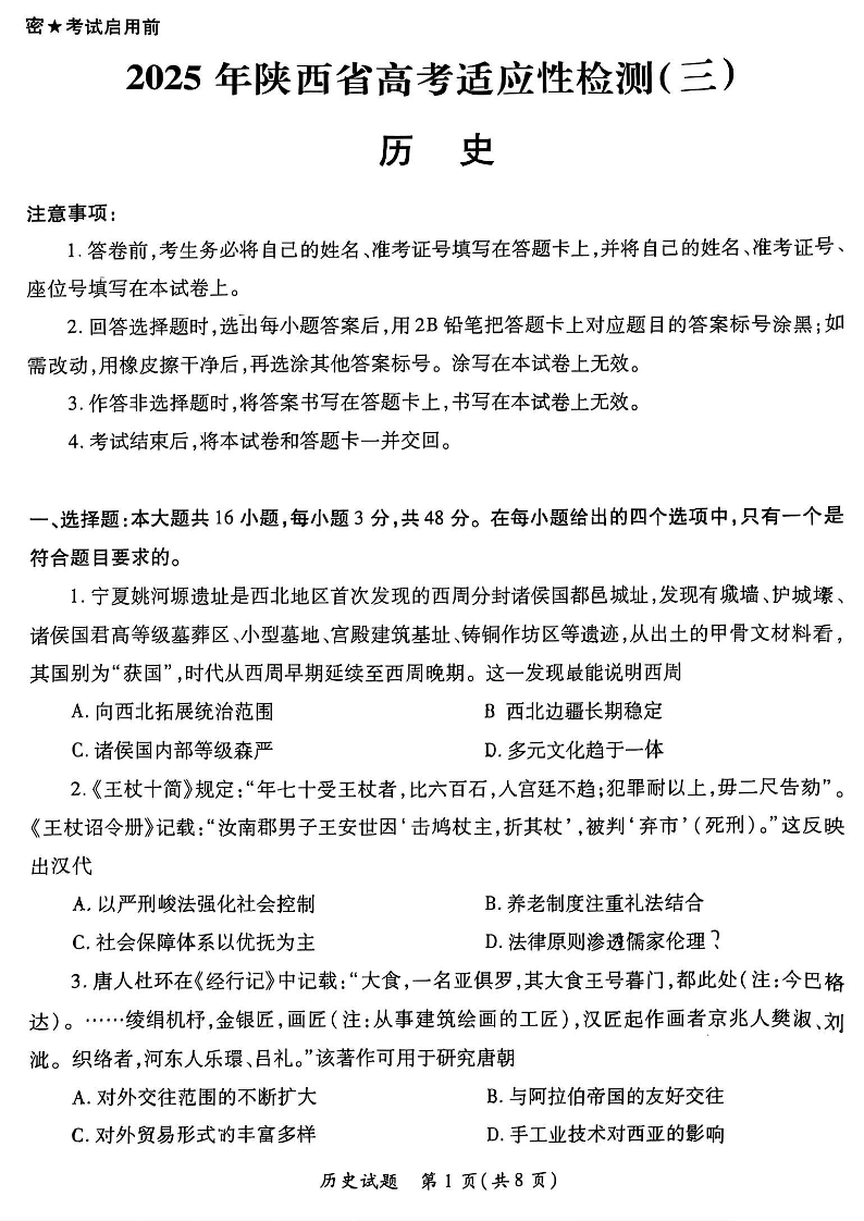 陕西省区域2024-2025学年下学期4月高三高考适应性检测(三)历史+答案