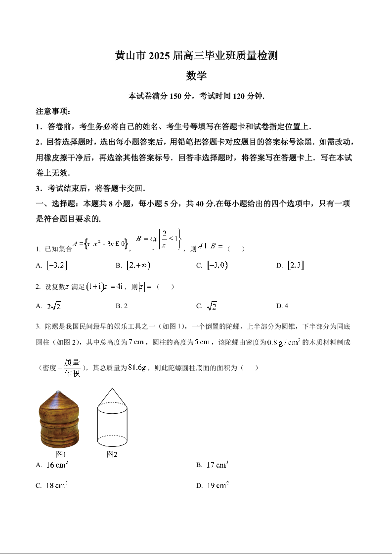 安徽省宣城市黄山市2024-2025学年下学期高三二模检测数学(原卷版)