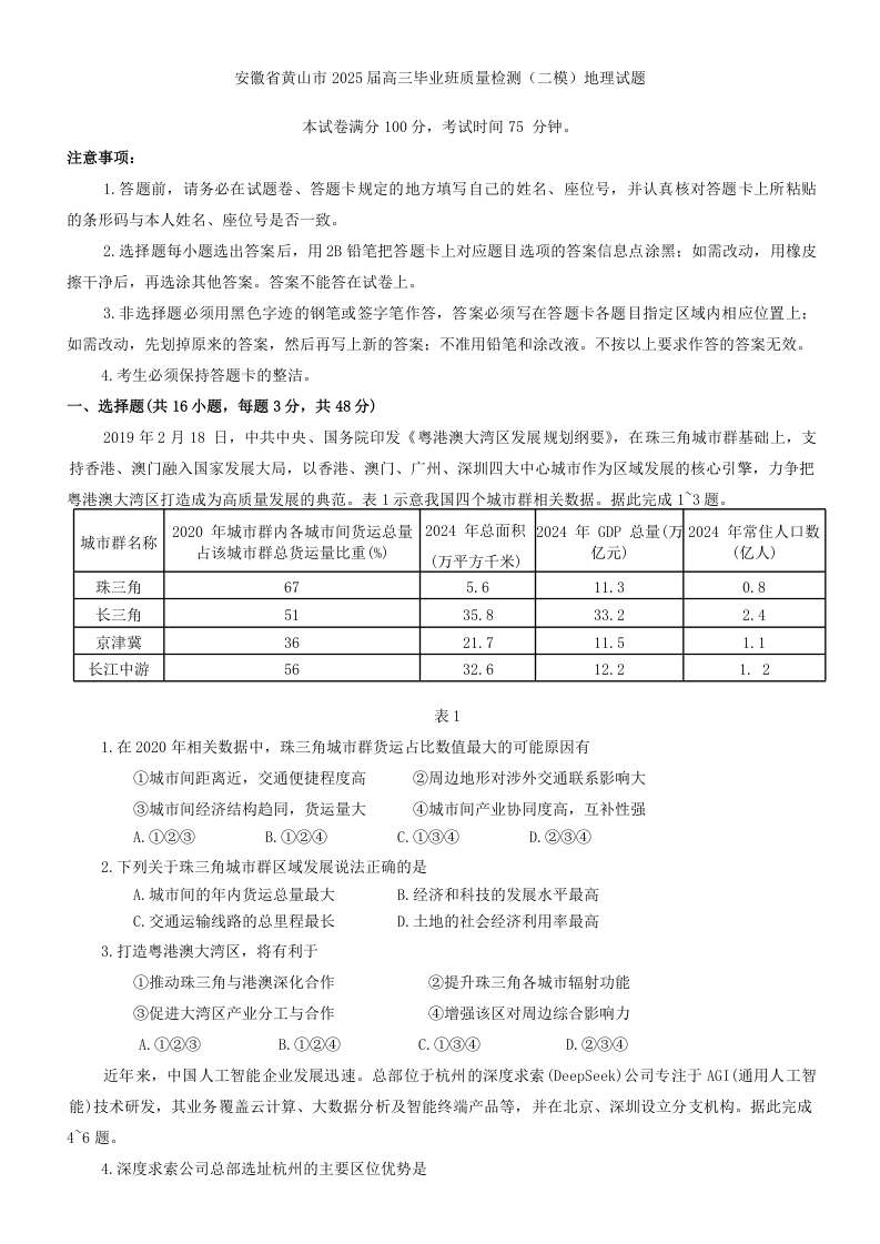 安徽省宣城市黄山市2024-2025学年下学期高三二模检测地理+答案