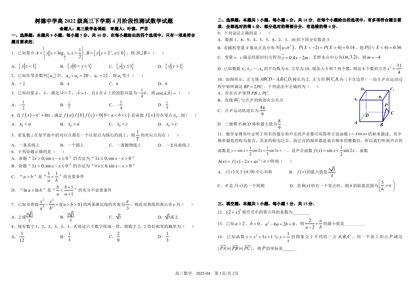 四川省成都市树德中学2024-2025学年下学期4月高三月考数学