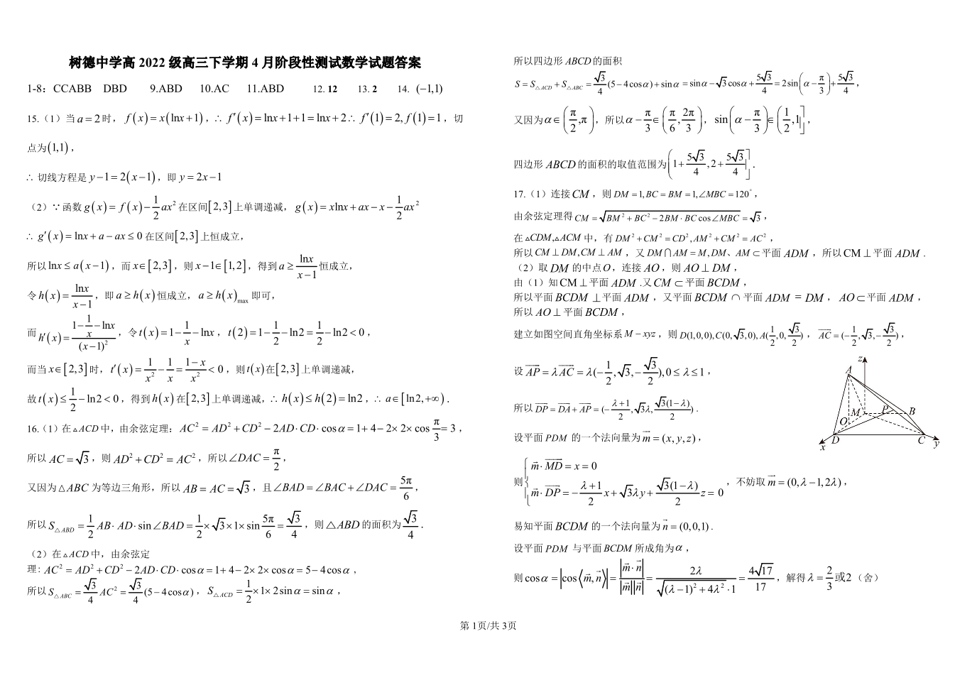 四川省成都市树德中学2024-2025学年下学期4月高三月考数学答案