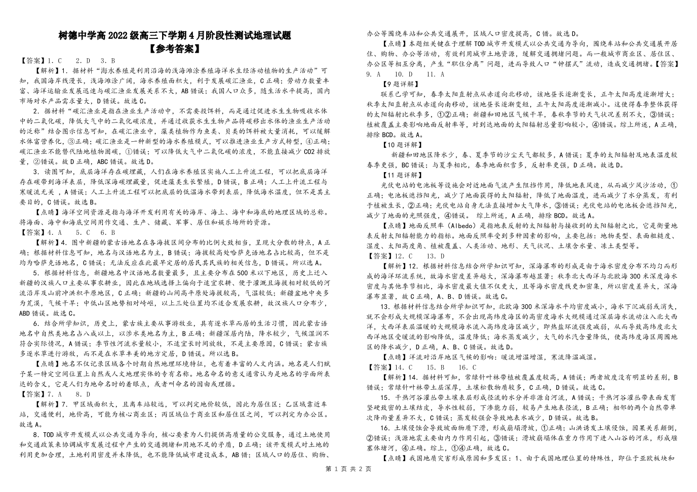 四川省成都市树德中学2024-2025学年下学期4月高三月考地理答案