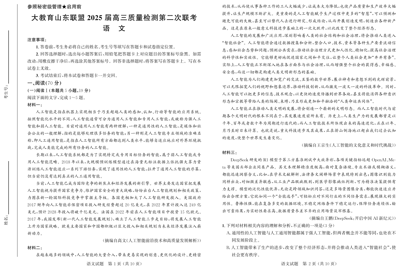 山东省部分高中2024-2025学年下学期高三质量联考语文