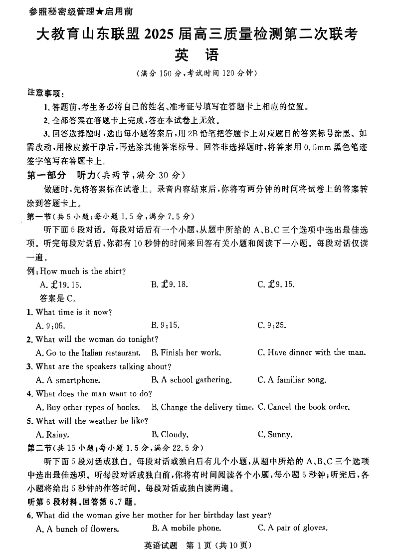 山东省部分高中2024-2025学年下学期高三质量联考英语