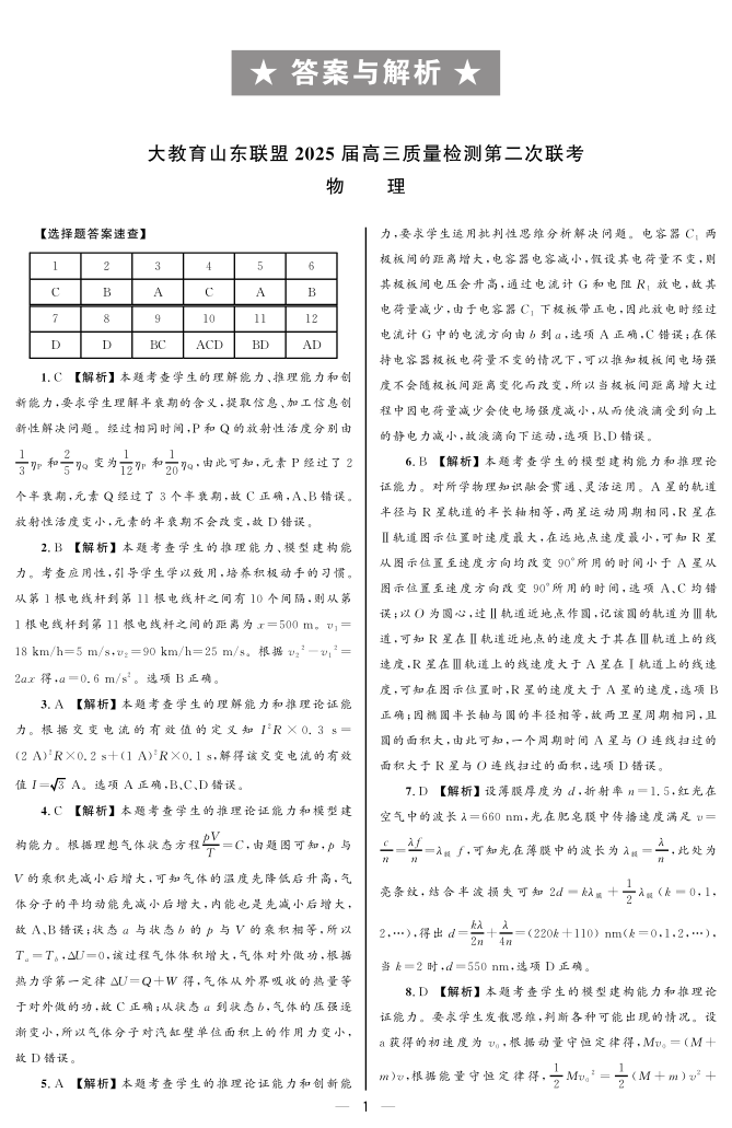 山东省部分高中2024-2025学年下学期高三质量联考物理答案