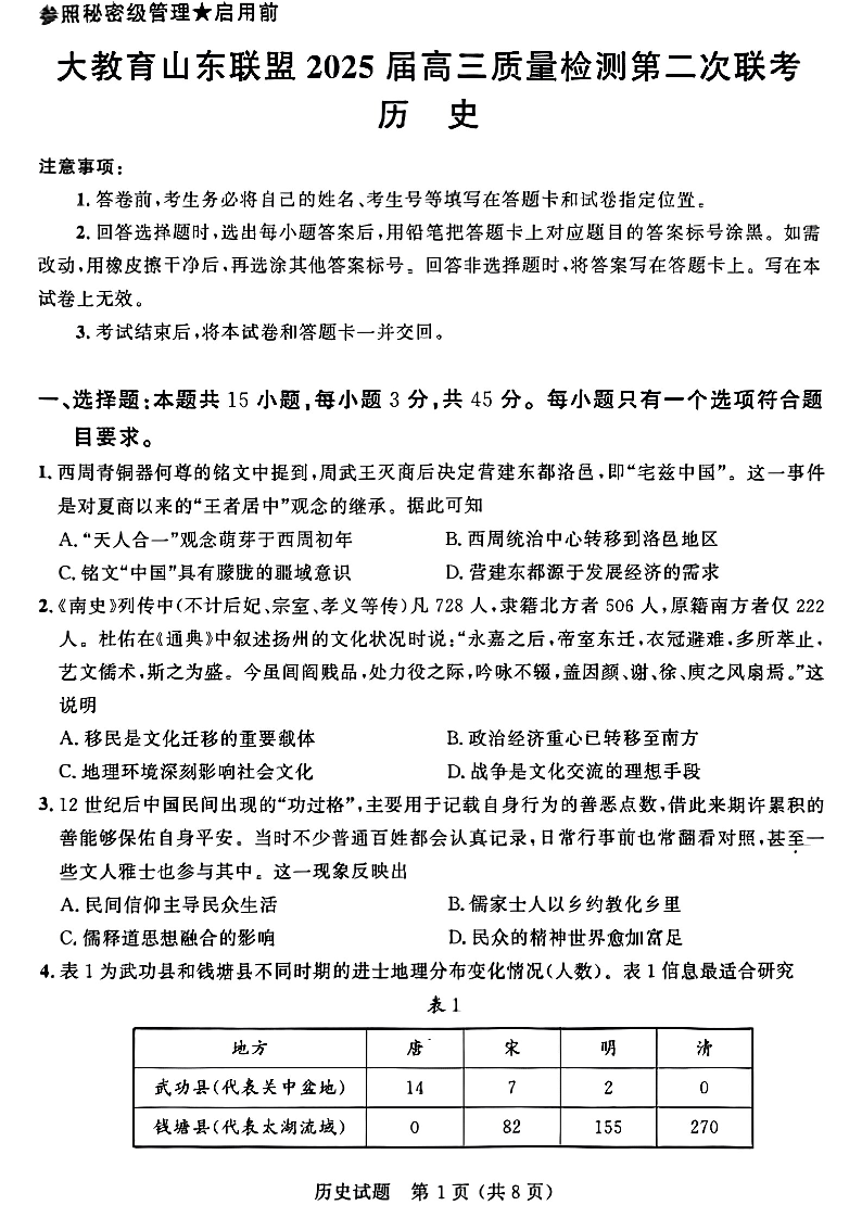 山东省部分高中2024-2025学年下学期高三质量联考历史