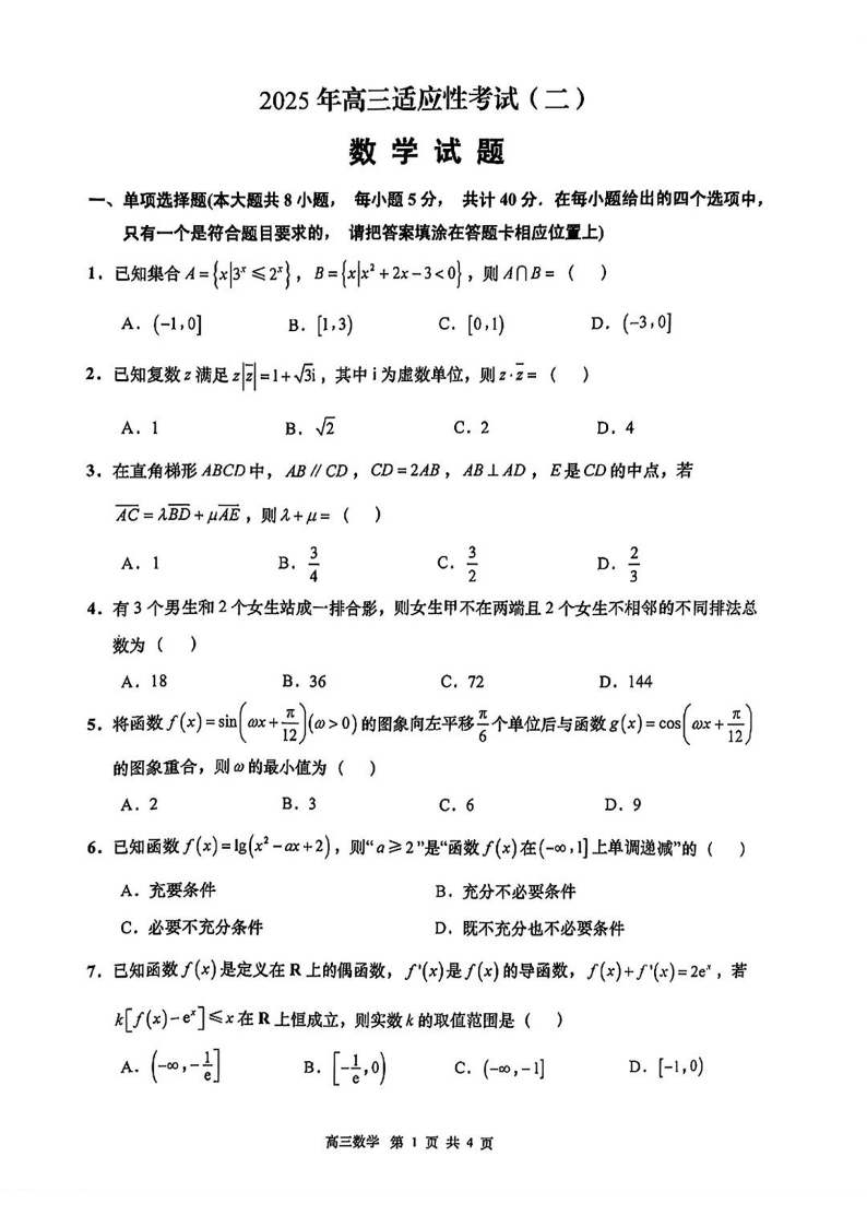 江苏省南通市如皋市2024-2025学年下学期高三适应性考试(二)数学+答案