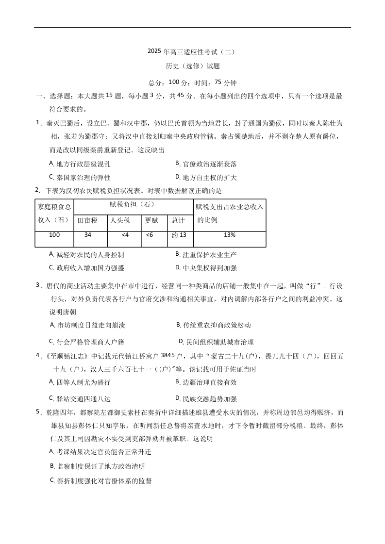 江苏省南通市如皋市2024-2025学年下学期高三适应性考试(二)历史+答案