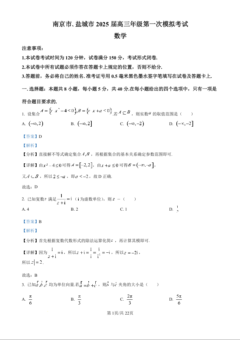 江苏省南京市、盐城市2024-2025学年下学期高三二模数学(精品解析版)