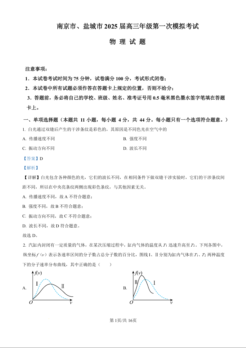 江苏省南京市、盐城市2024-2025学年下学期高三二模物理(精品解析版)