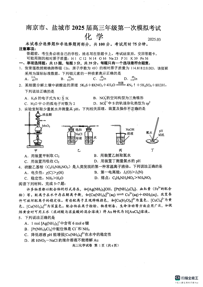 江苏省南京市、盐城市2024-2025学年下学期高三二模化学