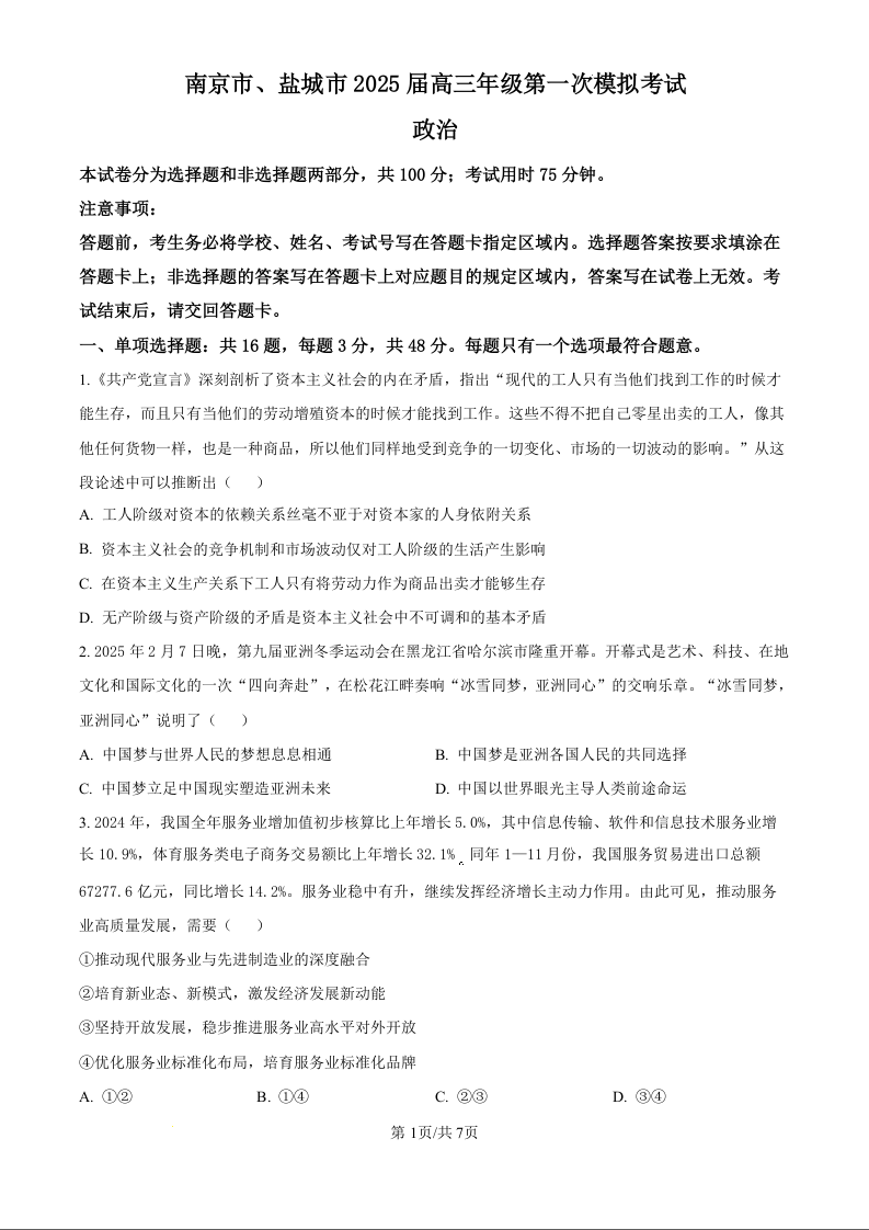 江苏省南京市、盐城市2024-2025学年下学期高三二模政治(原卷版)