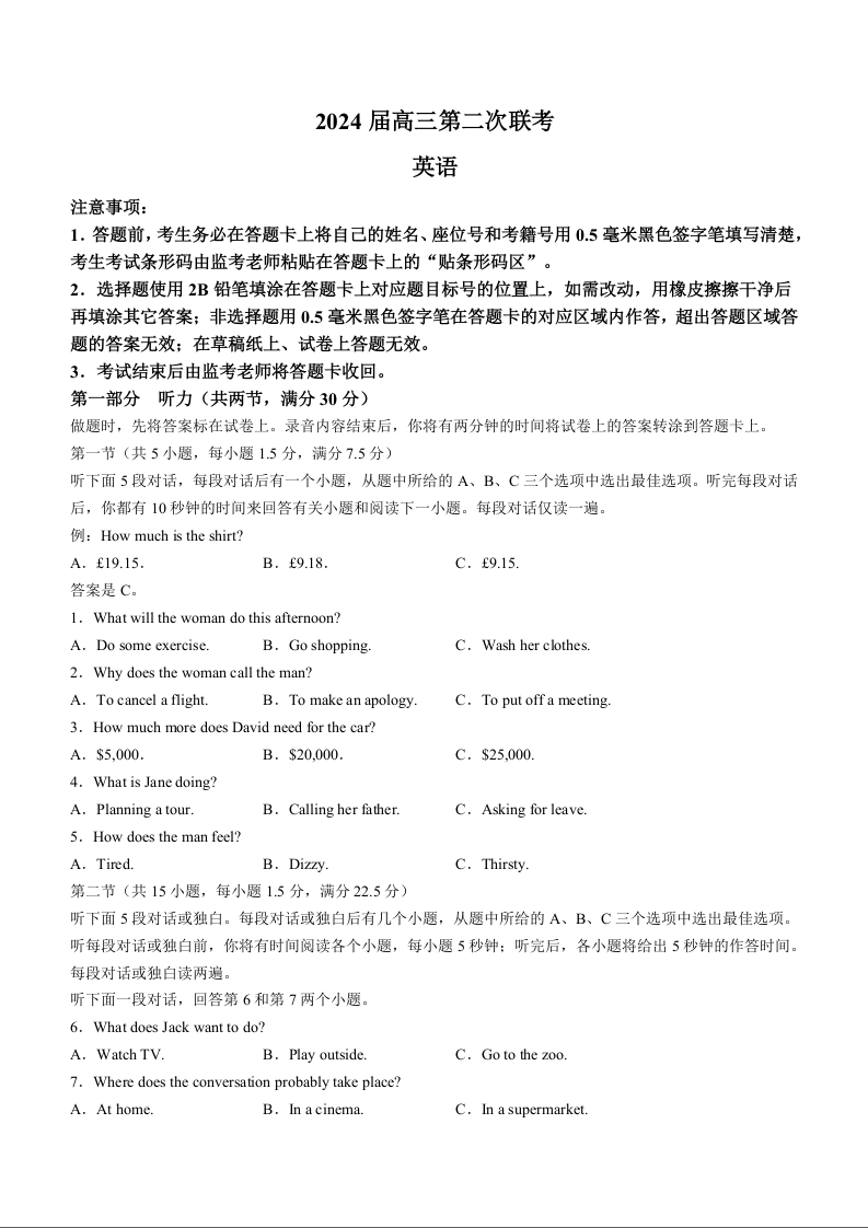2024届四川省成都市蓉城联盟高三下学期第二次联考英语+答案