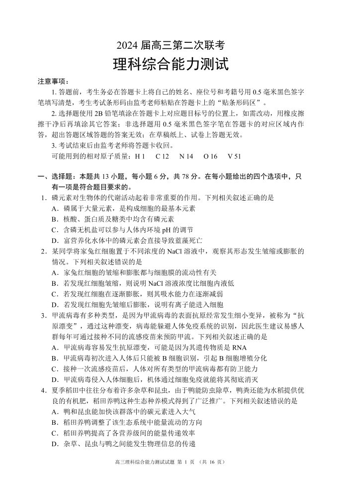 四川省成都市蓉城联盟2024届高三下学期第二次联考理综