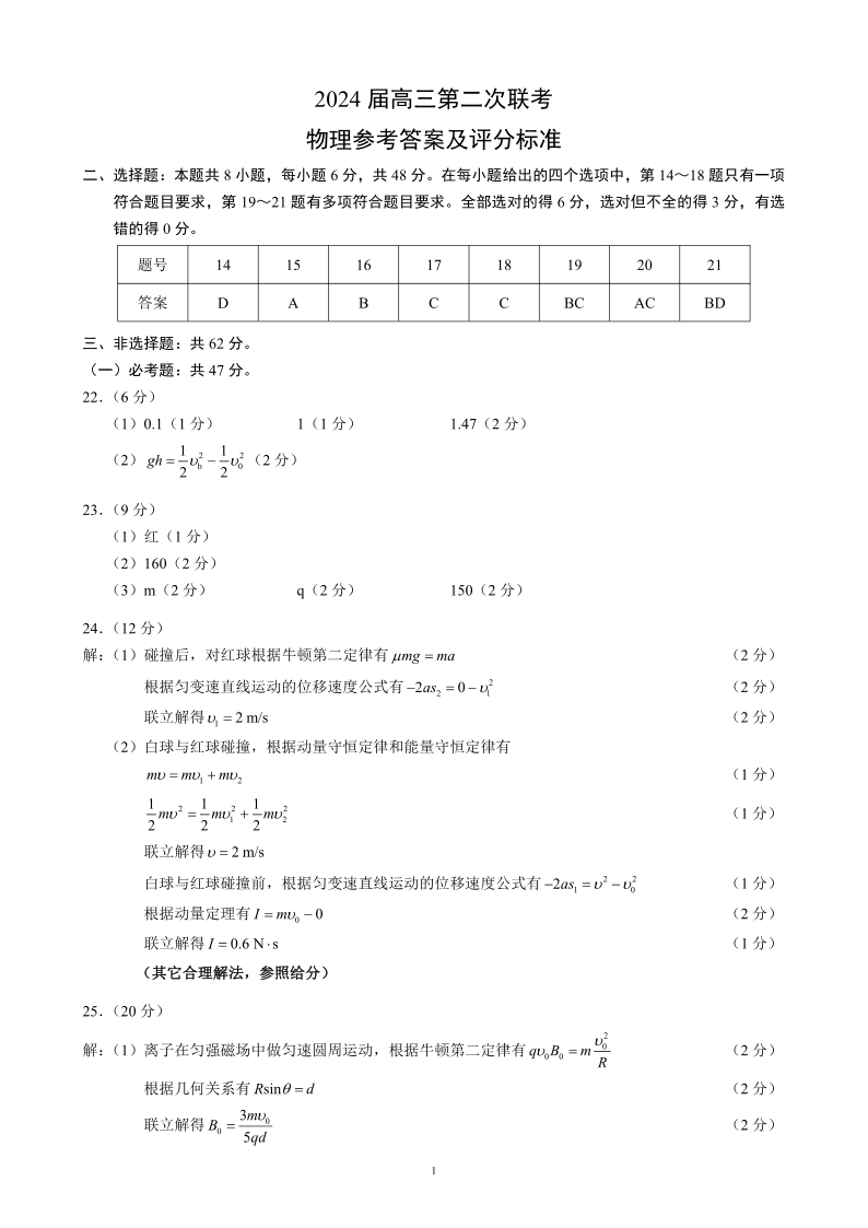 四川省成都市蓉城联盟2024届高三下学期第二次联考物理答案