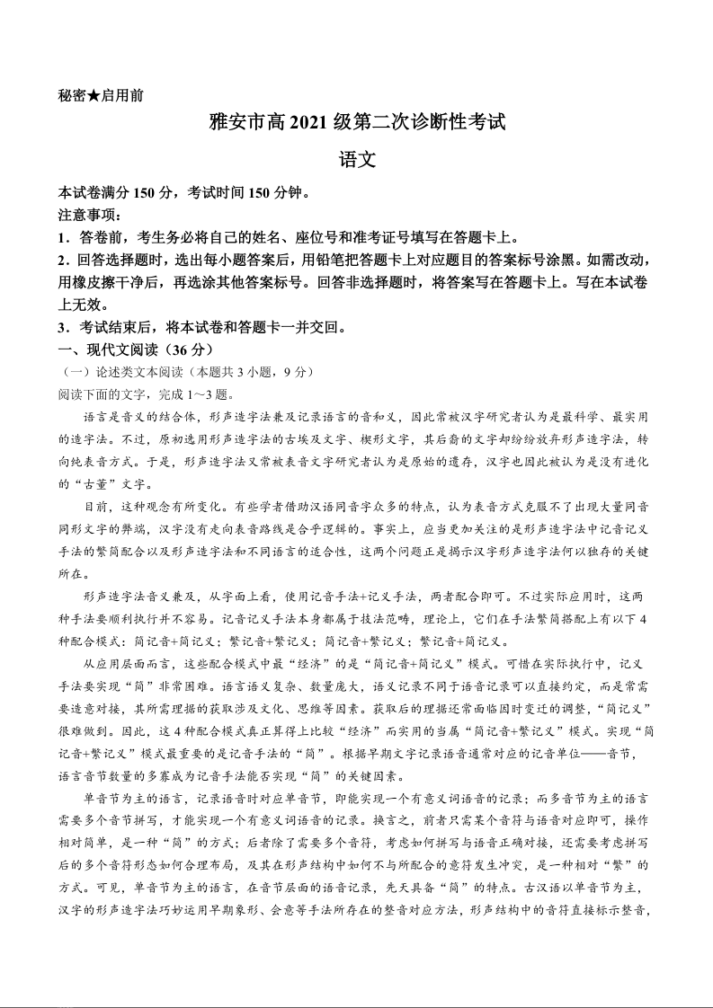 四川省九市(广安、眉山、遂宁、雅安、资阳、乐山、广元、自贡、内江)2024届第二次诊断考试语文+答案