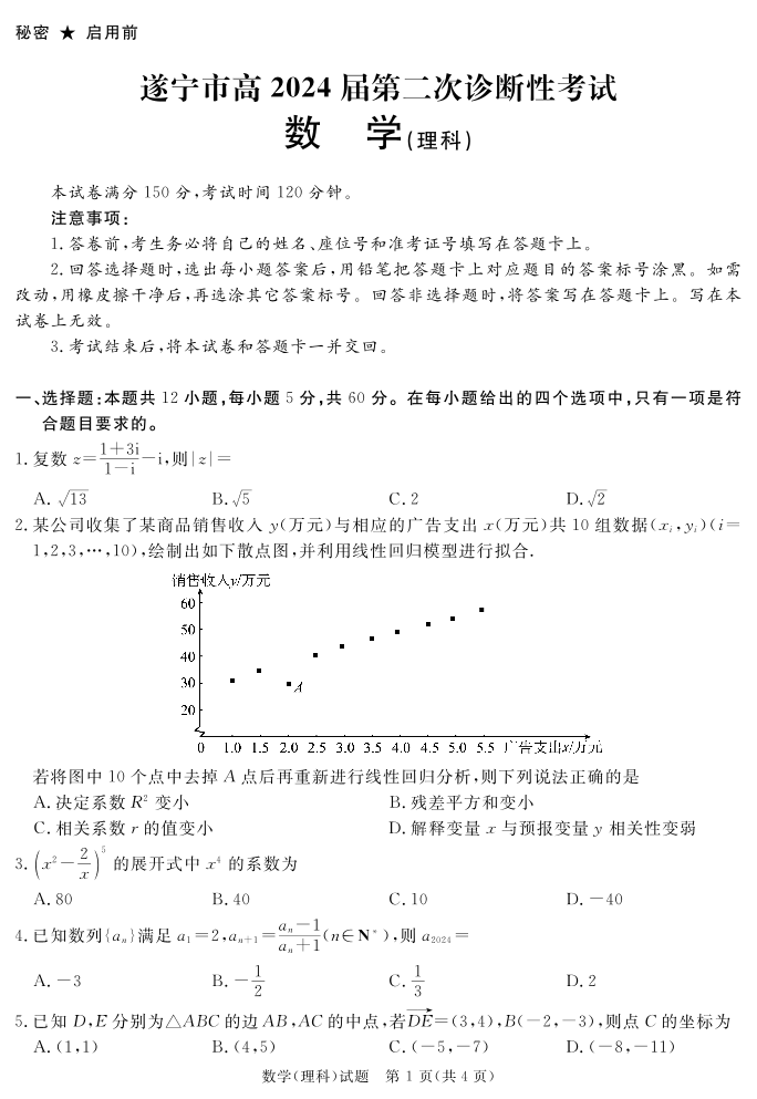 四川省九市(广安、眉山、遂宁、雅安、资阳、乐山、广元、自贡、内江)2024届第二次诊断考试理科数学