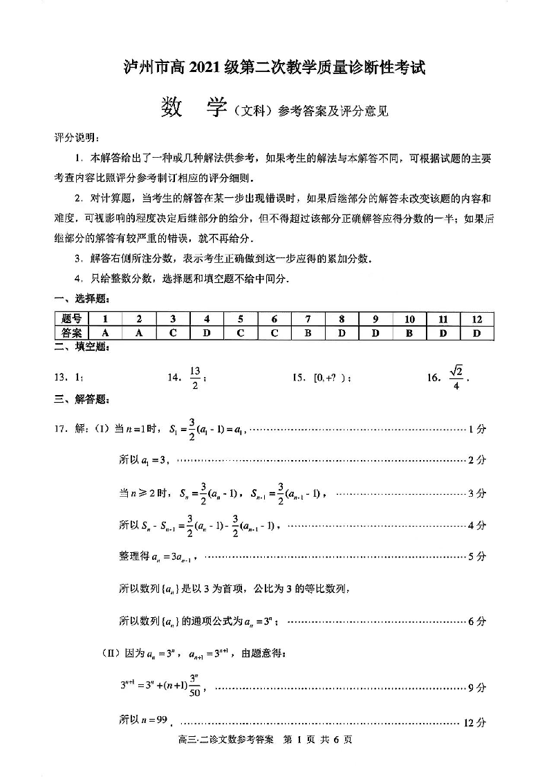 四川省泸州市2024届高三第二次教学质量诊断性考试文科数学答案