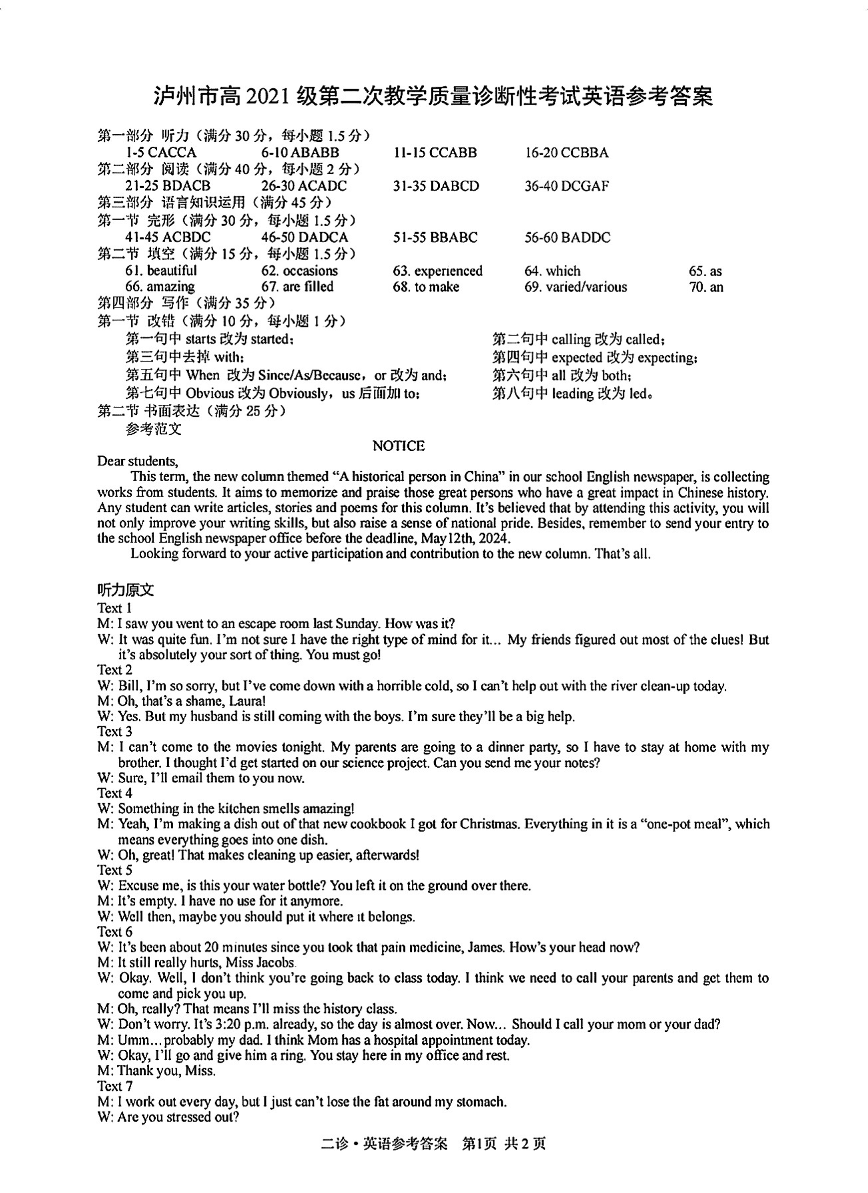 四川省泸州市2024届高三第二次教学质量诊断性考试英语答案