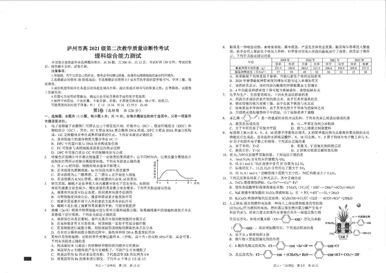 四川省泸州市2024届高三第二次教学质量诊断性考试理综