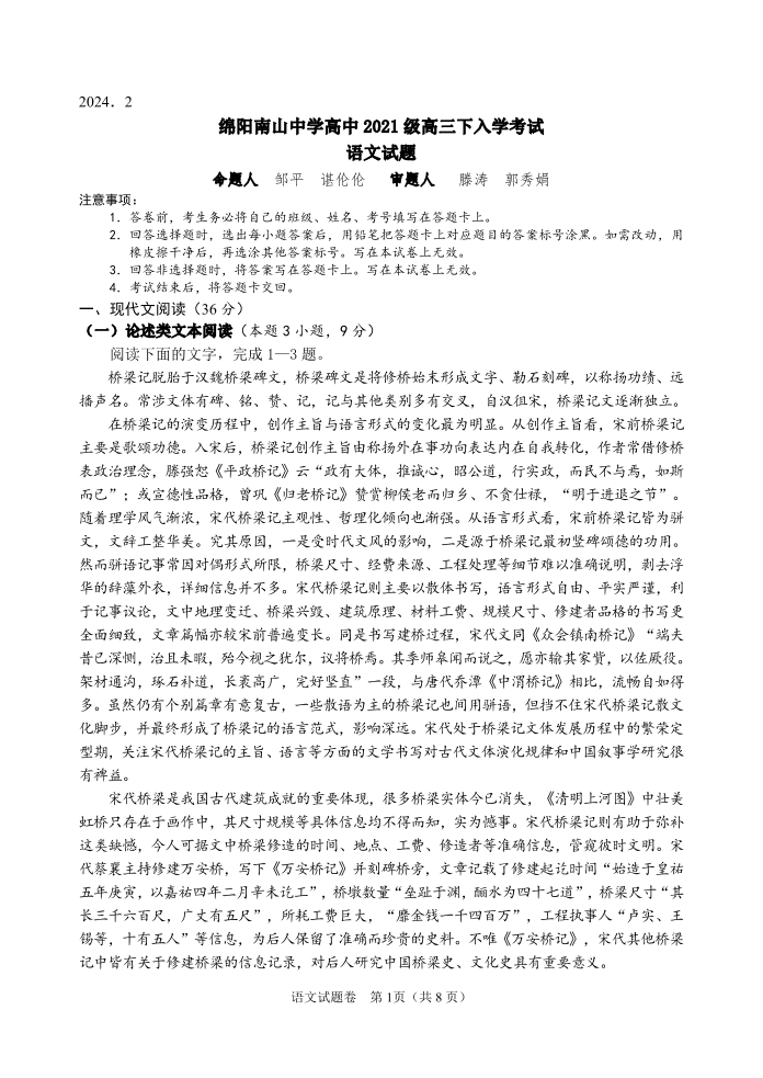 四川省绵阳南山中学2024届高三下学期入学考试语文