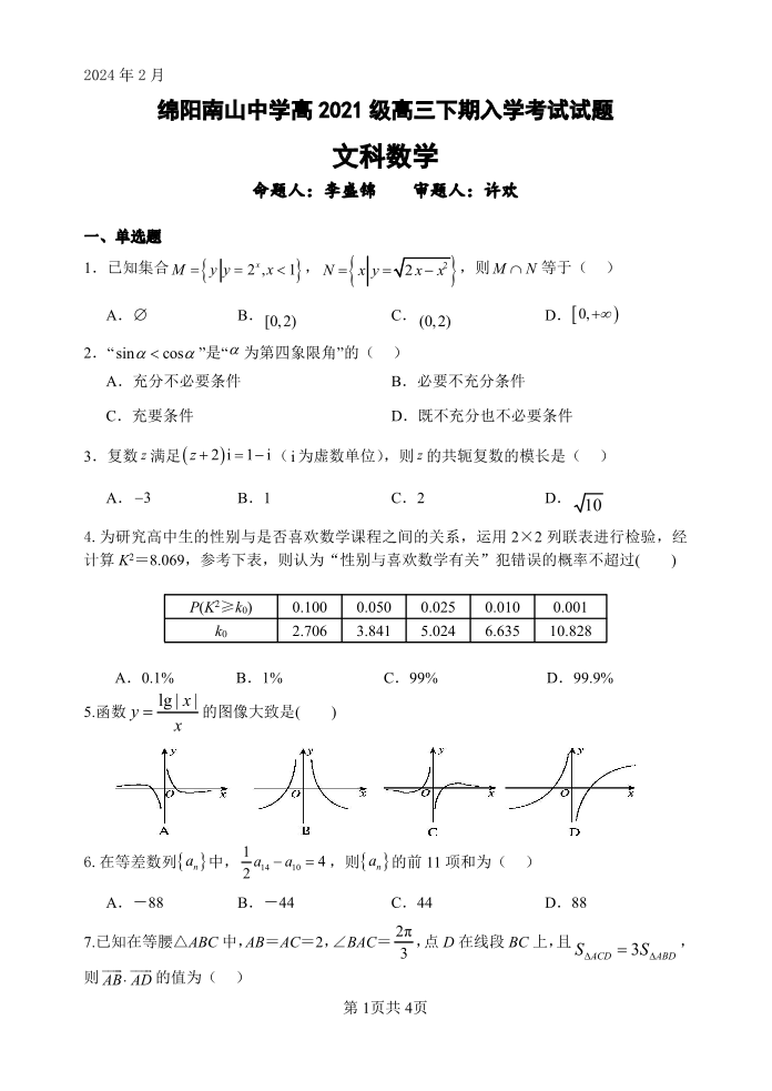 四川省绵阳南山中学2024届高三下学期入学考试文科数学