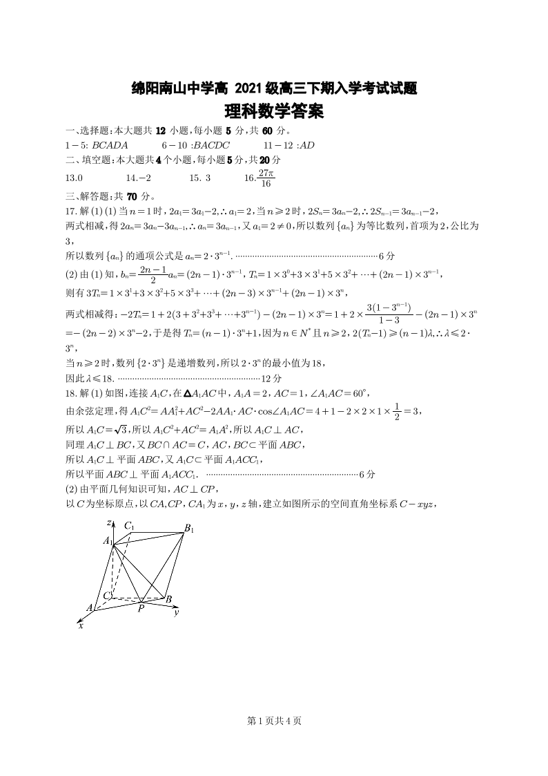 四川省绵阳南山中学2024届高三下学期入学考试理科数学答案