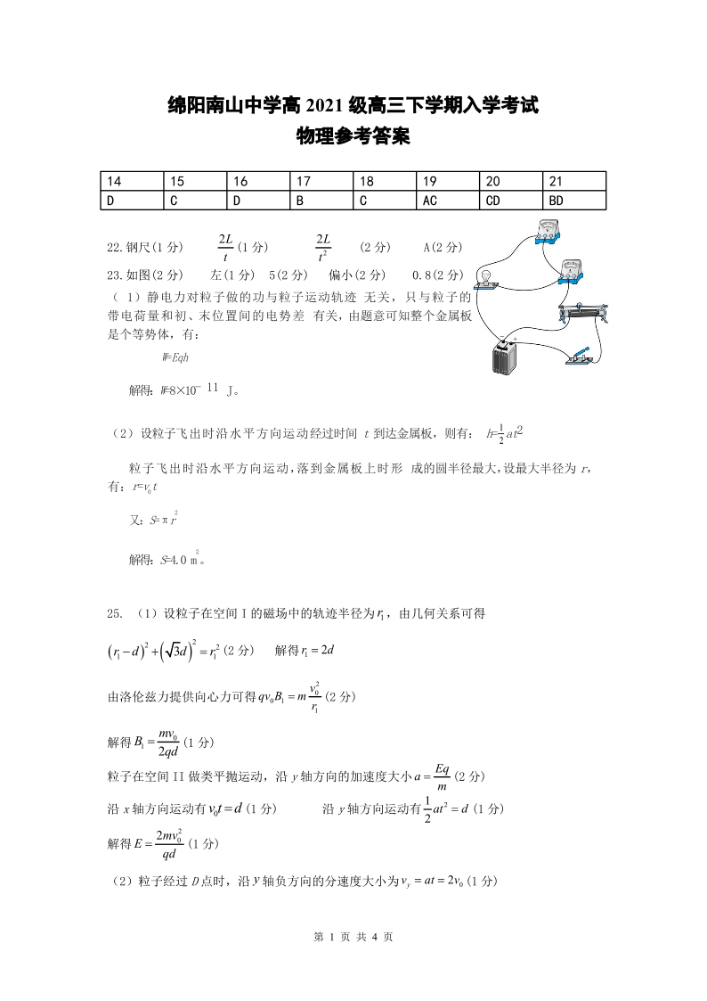 四川省绵阳南山中学2024届高三下学期入学考试理综答案