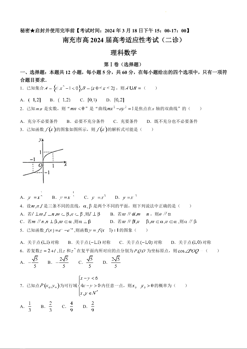 四川省南充市2024届高三高考适应性考试(南充二诊)理科数学