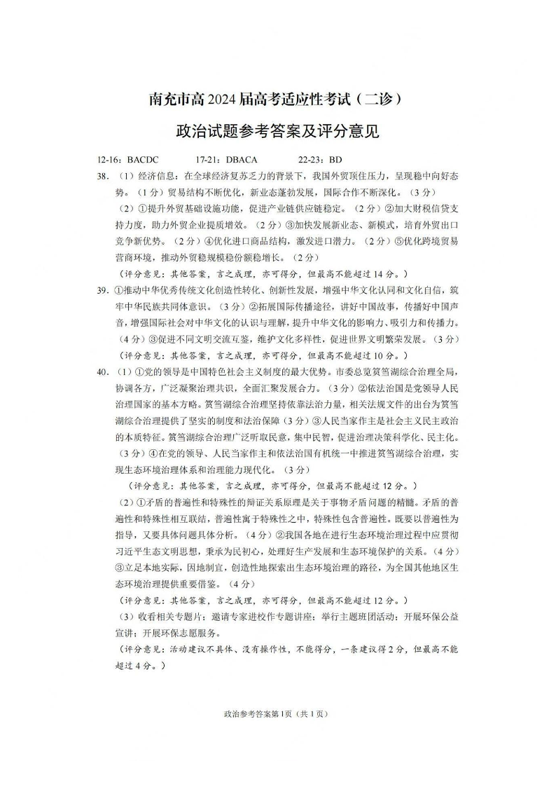 四川省南充市2024届高三高考适应性考试(南充二诊)文综答案