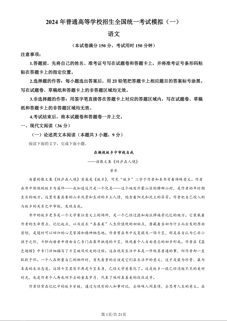 四川省成都外国语学校2024届高三下学期高考模拟(一)语文(精品解析版)