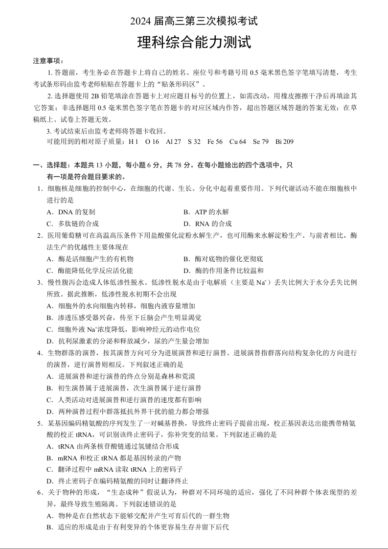 四川省成都市蓉城名校联盟2024届高三下学期第三次模拟考试理综+答案