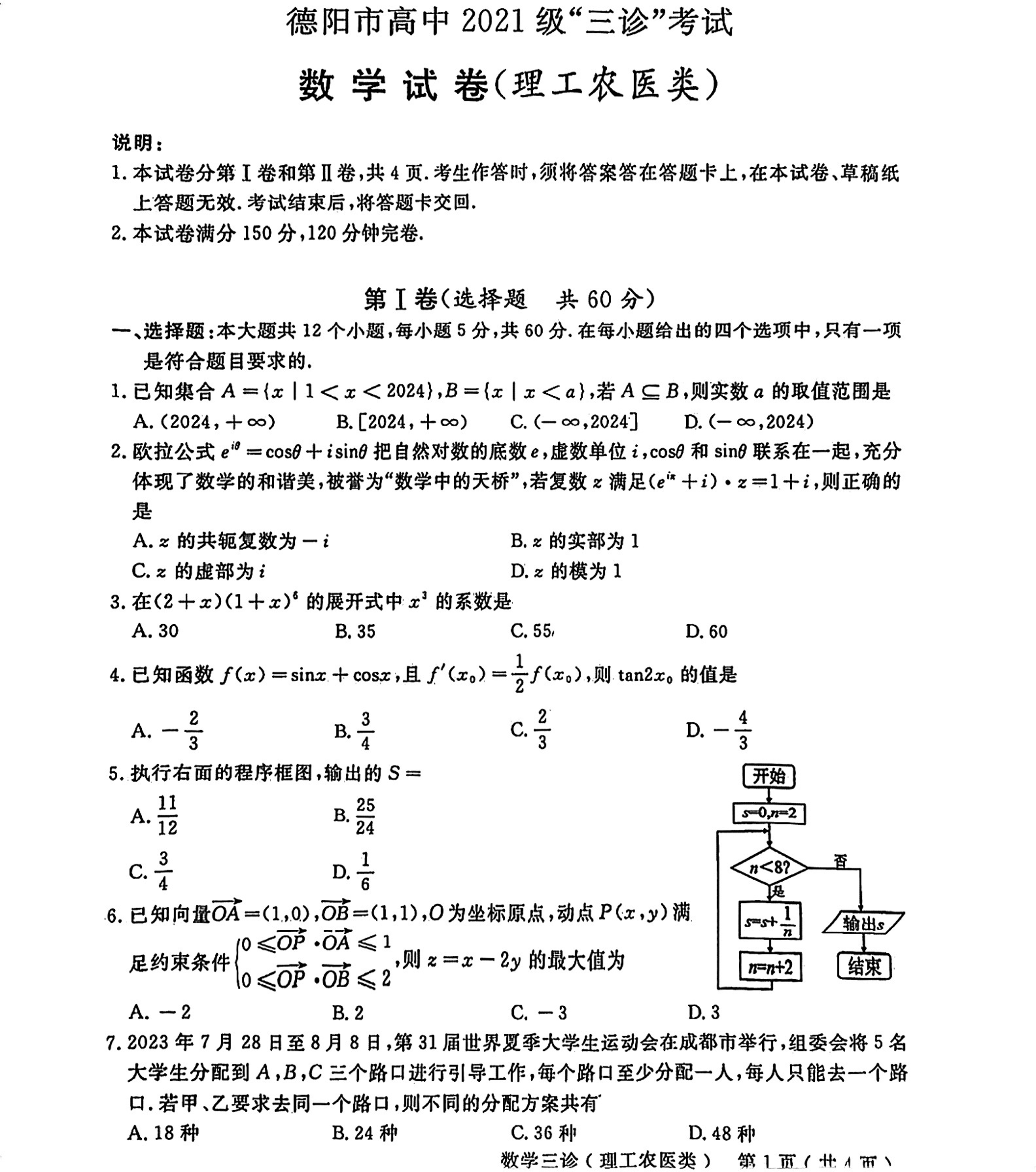 四川省德阳市2024届高三下学期三诊考试理科数学