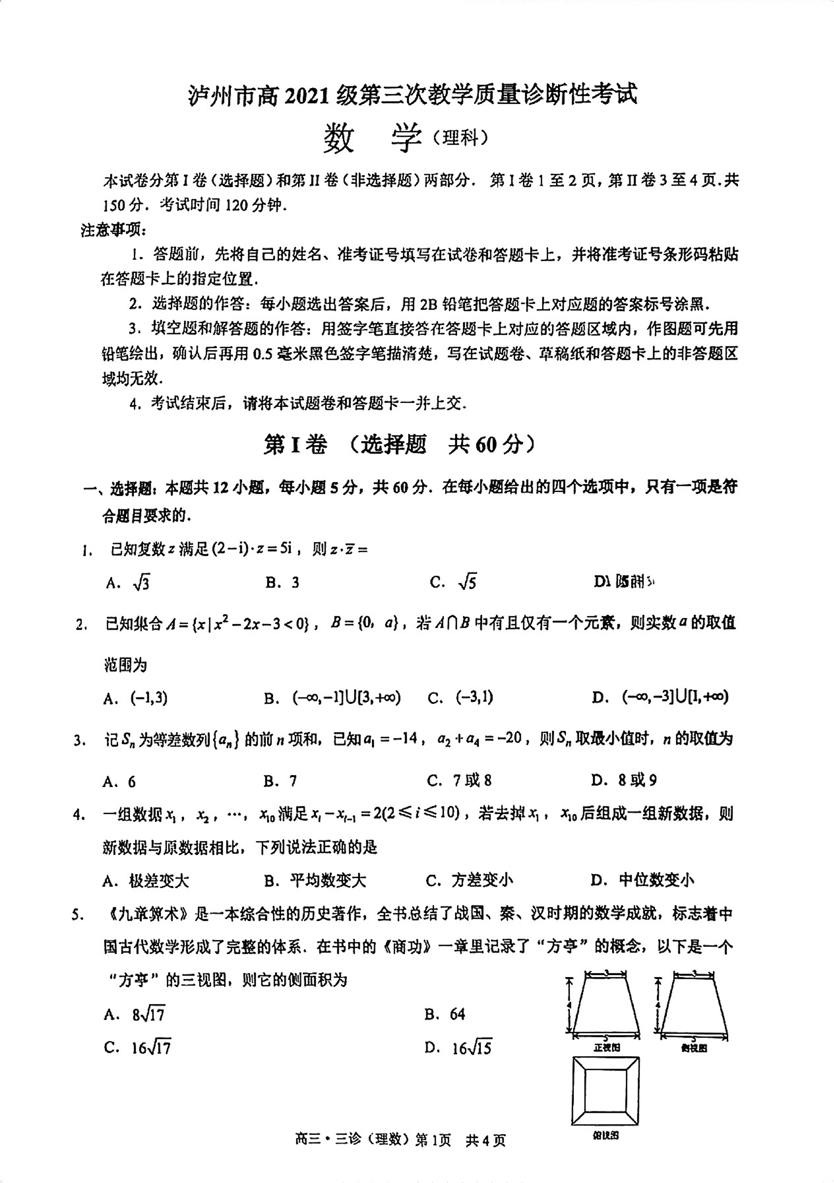 四川省泸州市高2021级第三次教学质量诊断性考试(泸州三诊)理科数学