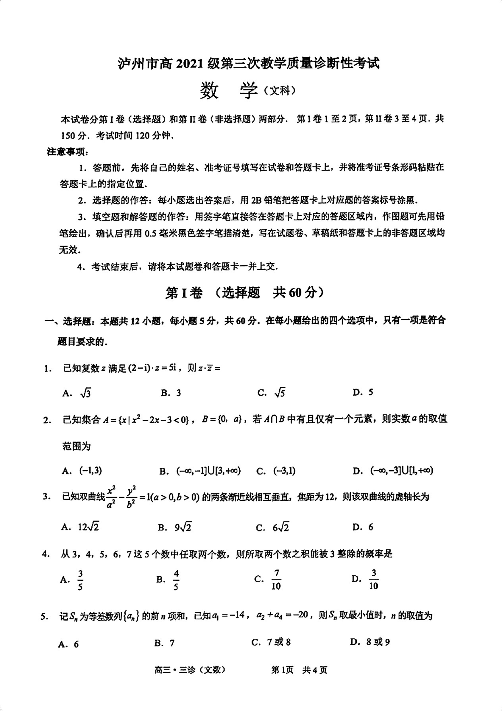 四川省泸州市高2021级第三次教学质量诊断性考试(泸州三诊)文科数学