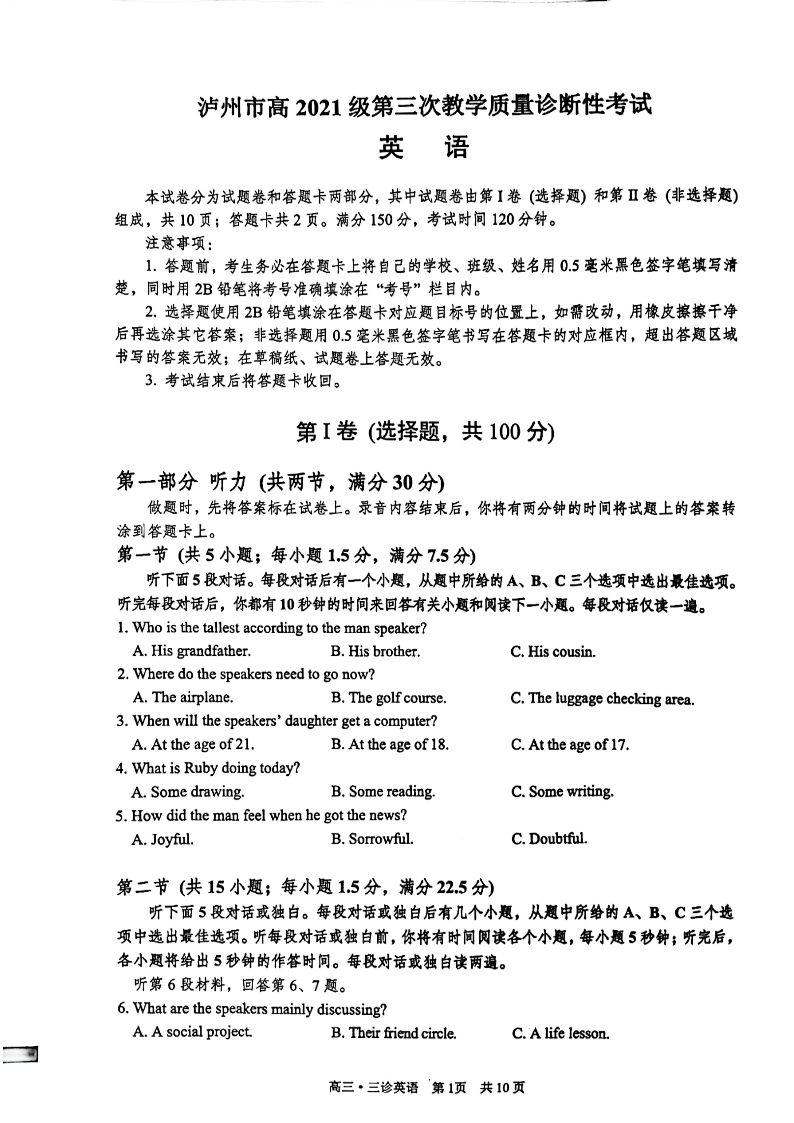 四川省泸州市高2021级第三次教学质量诊断性考试(泸州三诊)英语