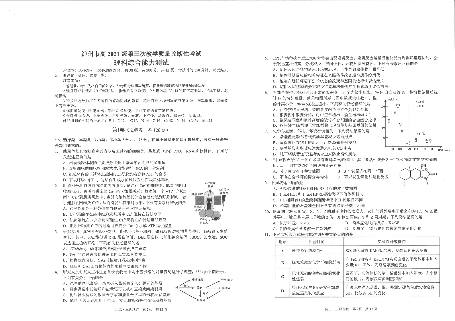 四川省泸州市高2021级第三次教学质量诊断性考试(泸州三诊)理综