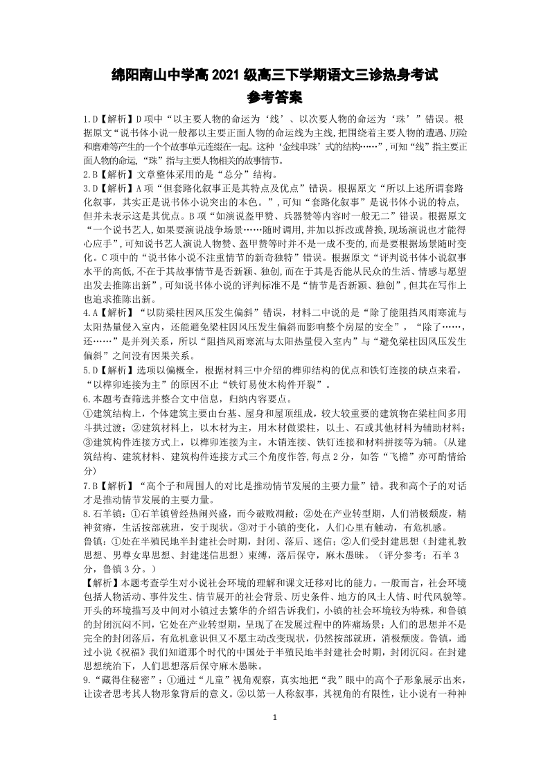 四川省绵阳南山中学2024届高三下学期4月绵阳三诊热身考试语文答案