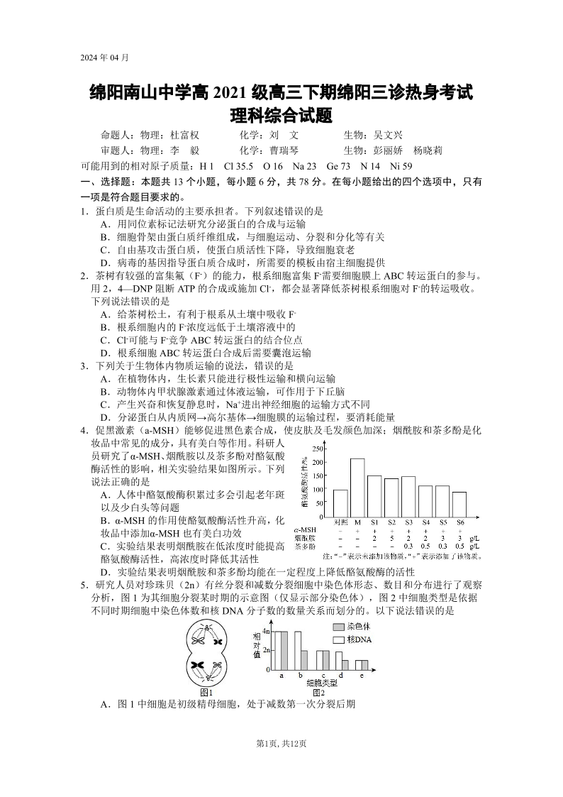 四川省绵阳南山中学2024届高三下学期4月绵阳三诊热身考试理综